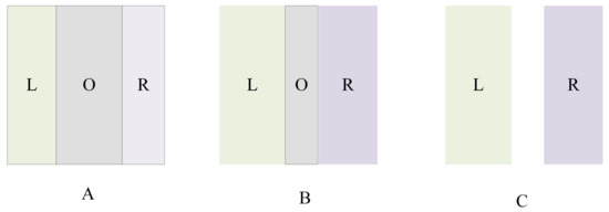 Diagram of the overlapping areas at different rotation angles. (A) indicates that when the rotation angle is 30°, its overlap area is larger; (B) indicates that when the rotation angle is 60°, the overlap area has been reduced compared to 30°; (C) indicates there is no overlap area.