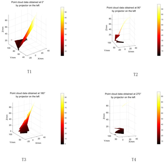 We set the rotation angle to 60° to optimize the acquisition of point cloud data, make the amount of point cloud data moderate, facilitate the later point cloud processing, and avoid the loss or redundancy of point cloud data, thus ensuring the accuracy and speed of the 3D reconstruction. The principle of angle selection is that it needs to be divisible by 360°. When using smaller rotation angles, such as 20°, 30°, 45°, more image groups need to be captured during a full 360° rotation, which takes more time than a 60° rotation angle. Secondly, there are a large number of overlapping areas in camera shooting in the process of small-angle rotation, resulting in the redundancy of phase extraction and point cloud data angle. In the process of 3D reconstruction, these redundant point cloud data must be removed, resulting in a large amount of calculation. When the rotation angle is set to 90°, due to the limited imaging field of view of the camera, some areas of the measured object will fail to enter the camera field of view. As a result, the measured object cannot be fully imaged, point cloud data is missing, and effective splicing of point cloud data cannot be realized, resulting in reconstruction failure. In summary, it is more appropriate to set the rotation angle to 60°. As shown in Figure 7, L represents the area projected on the left, R represents the area projected on the right, and O represents the overlapping area. Subfigure A indicates that when the rotation angle is 30°, its overlap area is larger; subfigure B indicates that when the rotation angle is 60°, the overlap area has been reduced compared to 30°. When the rotation angle is 90°, there is no overlap area. For a rotation angle of 90°, we also carried out relevant experiments, and the specific results are shown in the figure below. As can be seen from Figure 8. T4, due to the large rotation angle, the image will be missing and cannot be completely fused.