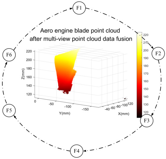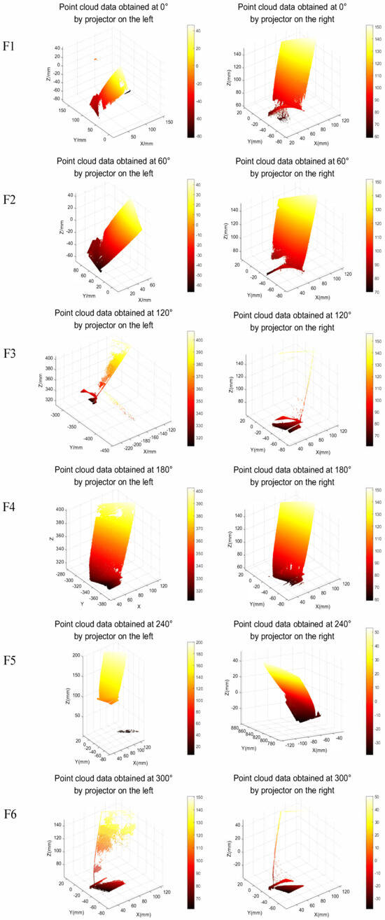 Multi-view point cloud data fusion, the blade on the rotating platform at 60° counterclockwise rotation. F1, F2,…F6 indicates 0°, 60°…At 300°, the left and right projectors capture the point cloud data obtained by the aviation blades.