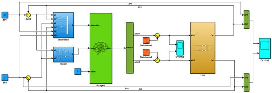 The TITO system in Section 2 was used as an environment to build the deep-reinforcement-learning-based control system structure in Simulink, as shown in Figure 3.