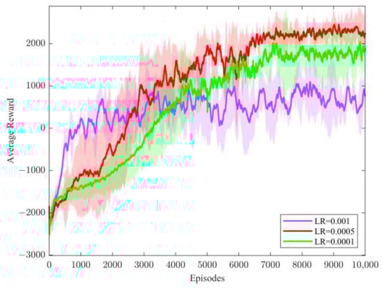 For the method proposed in this paper, to verify the effect of learning rate (LR) in the policy network on the performance of the algorithm, three different learning rates were selected for comparison, and the average reward curves are shown in Figure 5.