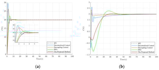 To verify the control performance of the proposed method, the setpoints were set to 20 for SP1 and 2 for SP2, and the control effects of different methods are shown in Figure 6.