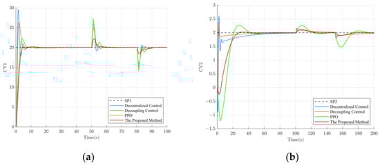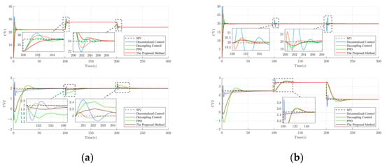 To verify the tracking and disturbance rejection performance of the proposed method, separate 300 s simulation experiments were conducted for loop 1 and loop 2. The experimental setup was as follows: Firstly, the setpoint of loop 2 was kept constant, while the setpoint of loop 1 increased to 28 at t = 100 s and decreased to 24 at t = 300 s. Since the controlled object is a multivariable coupled system, the variation in the setpoint of loop 1 can be considered as a disturbance relative to loop 2. This setup allows the assessment of different control methods in terms of their ability to suppress disturbances in the system. The experimental results are shown in Figure 8a. Similarly, by keeping the setpoint of loop 1 constant and increasing the setpoint of loop 2 to 3.5 at t = 100 s and decreasing it to 1.5 at t = 300 s, the disturbance rejection performance of different control methods can be evaluated. The experimental results are shown in Figure 8b.