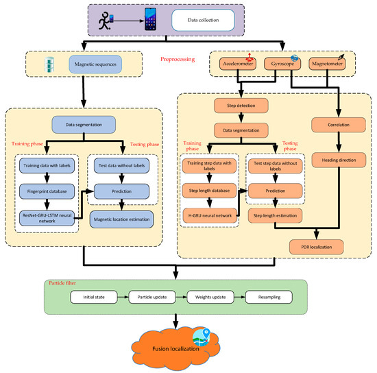 In our proposed localization system, both magnetic and PDR-based pedestrian location estimations are achieved by the deep learning method. In magnetic localization, a ResNet-GRU-LSTM network model is proposed to extract unique spatial-temporal features and thus achieve accurate prediction of pedestrian location. In PDR localization, we build a hierarchy GRU neural network for step length estimation; therefore, the accuracy of PDR localization can be improved. In addition, multidimensional datasets of magnetic signals and step length are created for more feature extraction. Finally, the deep learning-based magnetic and PDR localizations are fused through the particle filter framework.