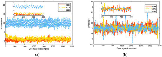 The raw inertial data used in this paper contains the three-axis accelerometer and three-axis gyroscope readings, which are collected by a smartphone. As shown in Figure 4, both the acceleration and gyroscope readings change periodically, which is consistent with human walking. Therefore, we can utilize this feature to segment the continuous pedestrian walking process into a single-step accumulation process for step length estimation.