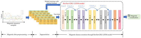 Magnetic signals are highly stable when the indoor environment is unchanged and constant. Abundant magnetic abnormalities contain unique clues that facilitate indoor localization. However, magnetic feature extraction deficiency and similar magnetic signals may exist in complex, symmetric, and large-scale indoor environments, resulting in ambiguous localization during the matching phase. ResNet can effectively capture the local correlated features of the input data, extracting and learning the implied features in the magnetic subsequences. Consider the computational complexity. GRU can reduce computational complexity and further extract the temporal features of the magnetic subsequences. LSTM can extract global temporal features; therefore, accurate predictions can be achieved. Therefore, we propose a ResNet-GRU-LSTM network model for magnetic localization in this paper. The magnetic localization based on the proposed ResNet-GRU-LSTM model is shown in Figure 6.