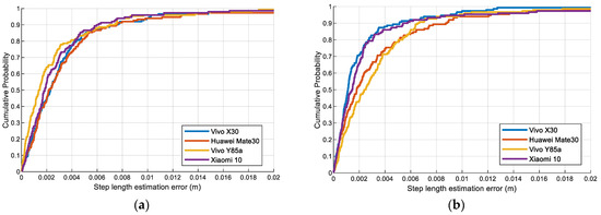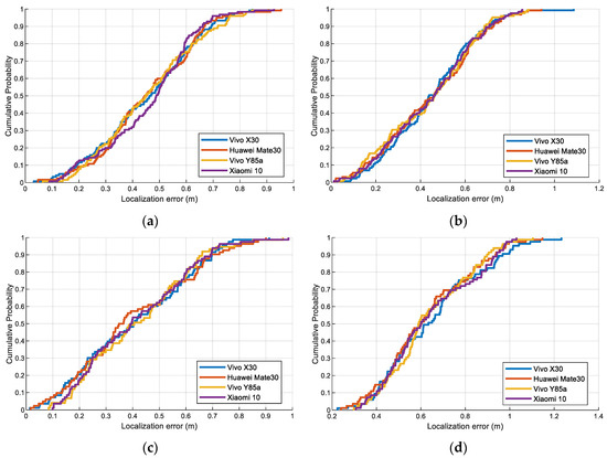 The CDF of the proposed localization method using Vivo X30, Huawei Mate30, Vivo Y85a, and Xiaomi 10 devices: (a) Pedestrian #1 in scene 1. (b) Pedestrian #2 in scene 1. (c) Pedestrian #1 in scene 2. (d) Pedestrian #2 in scene 2.
