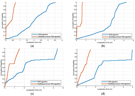The CDF of localization error for different methods is shown in Figure 16. From these figures, it can be seen that the localization error of our proposed method is the smallest compared to those of state-of-the-art methods in different scenarios with different pedestrians. These results occur because the ResNet exhibits an outstanding ability for feature extraction, and the LSTM could extract global temporal magnetic features for more accurate information; thus, the forecasting ability of the ResNet-GRU-LSTM model is further enhanced. Besides, the localization algorithm fused with the deep learning-based PDR algorithm can effectively eliminate the ambiguous location errors caused by magnetic and PDR localization.