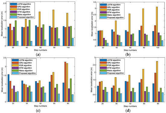 Mean localization errors of LSTM, GRU, PDR, DTW, MaLoc, and the proposed method under varied step numbers: (a) Pedestrian #1 in scene 1. (b) Pedestrian #2 in scene 1. (c) Pedestrian #1 in scene 2. (d) Pedestrian #2 in scene 2.
