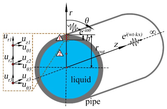 Figure 1 displays the schematic diagram of liquid-filled pipe in the cylindrical coordinate system, and the space-time harmonic function ei(ωt−kx−nθ) is assumed to represent the propagation of UGW, where i is the imaginary unit, ω is the angular frequency, t is the time, k is the wavenumber, n is the circumferential order, r, θ and z denote the radial, circumferential and axial [33]. In the semi-analytical finite element (SAFE) method, the finite element can only be performed in the r direction and divided into two elements according to the material, and the displacement u of each node is divided into ur, uθ and uz.