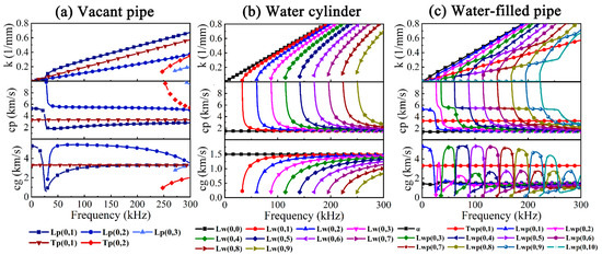 Dispersion curves of axisymmetric UGWs: (a) vacant pipe, (b) water cylinder and (c) water-filled pipe.