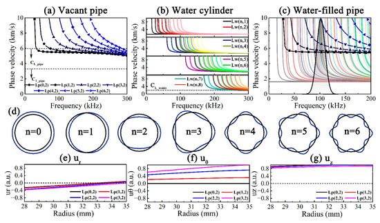 Dispersion curves of non-axisymmetric UGWs: (a) vacant pipe, (b) water cylinder and (c) water-filled pipe, (d) mode shapes, (e) radial, (f) circumferential and (g) axial displacement distributions of Lp(n,2) at 105 kHz.
