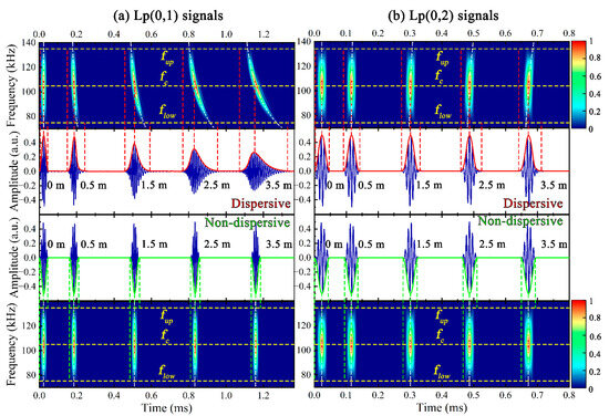 The time domain signals of Lp(0,1) and Lp(0,2) at different x (0.5 m, 1.5 m, 2.5 m, 3.5 m) are plotted in Figure 4. For ease of observation, the center frequency fc, the lower flow and upper fup frequency boundary of the excitation band are marked with yellow dashed lines in the time-frequency diagram, and the white dashed lines represent the group dispersion curves at the given x, which is calculated by x/cg(ω) + 0.5T, where T is the duration of the excitation signal.