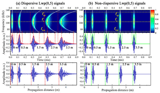 It can be observed that the dispersive Lp(0,1) exhibits significant attenuation and dispersion as the wave packet gradually becomes wider and the amplitude gradually becomes smaller as x increases, while the waveform and amplitude of the dispersive Lp(0,2) signal do not noticeably change with x. The dispersion-compensated time-distance mapping was performed on the above dispersive signals, the attenuation and waveform deformation could not be observed in the non-dispersive signals, which were consistent with the excitation signal except for the phase and time, and the group velocities of the non-dispersive signals could be considered as the fixed values for the time-frequency wave packets parallel to the frequency axis. Compared with the dispersive Lwp(0,5) signals in Figure 5, the non-dispersive Lwp(0,5) exhibited a better match with the actual x, which is favorable to guide the actual UGW testing.