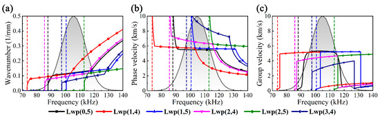 The multi-mode UGWs consisting of the target and its flexural UGWs were studied to set the stage for the following. Figure 6 depicts the dispersion curves in the excitation band, where the black and white gradient-filled portion of the solid black envelope represents Fe(ω) and the vertical dashed lines represent the cut-off frequencies. The most likely flexural UGWs converted from Lwp(0,5) within the excitation band include Lwp(1,4), Lwp(1,5), Lwp(2,4), Lwp(2,5) and Lwp(3,4).
