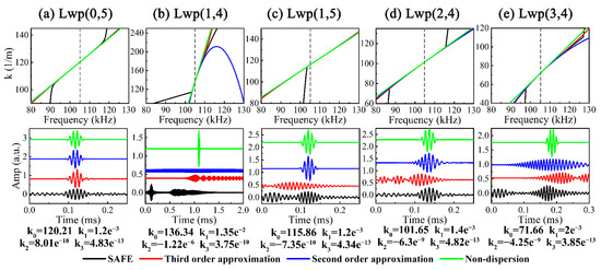 The asymptotic solutions of k from first to third order were studied in order to represent the above UGWs, where k3 = (d3k/dω3)|ωc/6; the results are indicated in Figure 7. However, the asymptotic solution does not truly reflect the variation of k over a wider frequency band and the steep change of k near ωc; i.e., a significant gap between the asymptotic and SAFE solution can be observed in Lwp(1,4), Lwp(1,5) and Lwp(3,4) near ωc. In addition, it can be observed that third-order asymptotic solution signals exist in the form of multi-wave packets.