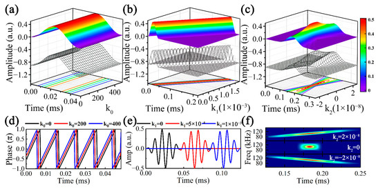 Assuming both k1 and k2 are zero, the effects of k0 on the atoms alone are displayed in Figure 8a. It is clear that k0 does not affect the envelope of the time-domain atoms. However, as can be observed by the instantaneous phases corresponding to different k0 (0, 200, 400) in Figure 8d, the instantaneous phases of the atoms all periodically and linearly change, and the change of k0 leads to a time shift in the instantaneous phase.
