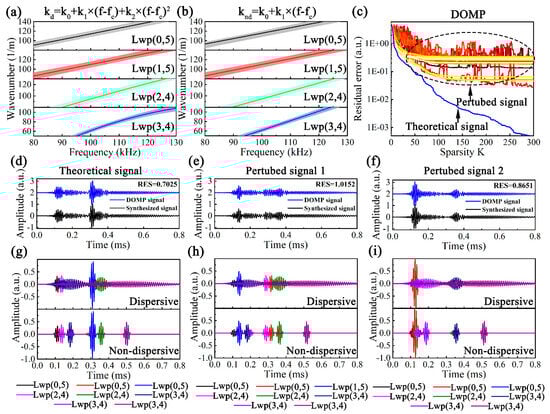 (a) Dispersive and (b) non-dispersive perturbed k of Lwp(0,5), Lwp(1,5), Lwp(2,4) and Lwp(3,4), (c) RESs of perturbed signals after applying DOMP, (d) theoretical signal, (e) perturbed signal 1 and (f) perturbed signal 2 before and after applying DOMP and decomposed atoms: (g) theoretical signal, (h) perturbed signal 1 and (i) perturbed signal 2.