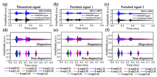 Dd and Dnd include the dictionaries of all modes, namely D = [D1, D2, D3, D4]. The parameters of Di can be expressed as , where fc and N are 105 kHz and 5, i denotes the i-th mode, and . Apply DOMP to the theoretical and perturbed signals, the RESs are shown in Figure 10c and the magnitude order of RES of the perturbed signal is basically stable around 10−1 after 300 iterations, while that of the theoretical signal is not gradually stable, but continues to decrease to 10−3 with iterations.