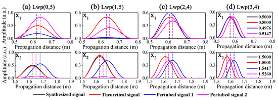 To clearly illustrate the position of the decomposed atoms of DMOMP in the distance domain, the peak positions of the different signals are indicated by dashed lines. For the wave packets at x1 = 0.5 m, the propagation distance and amplitude of the theoretical signal before and after processing are the same, which is also reflected by the overlap of the envelope. The propagation distance of the processed PS1 is almost the same as the theoretical value with an error of only 0.48%, and the error of the processed perturbed signal 2 is slightly larger at 2.94%. For the wave packets at x2 = 1.5 m, the dispersion phenomenon is more serious and the processing effect of DMOMP becomes slightly worse, especially for the perturbed signals, and their errors are 2.78% and 1.73%, but they are still lower than those of DOMP.