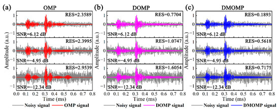 It is essential to analyze the noise sensitivity for the influence of non-coherent noise induced by environmental factors. The noisy signals composed of theoretical signal and noise were obtained, where the noise level is represented by the signal-to-noise ratio (SNR), and the reconstructed signals of OMP, DOMP and DMOMP are displayed in Figure 13. As the noise level increases, the SNR becomes lower, and the RES gradually becomes larger, indicating the certain influence of noise on the reconstruction accuracy. When the noise level is large (SNR = −12.34 dB), the theoretical signal is almost completely drowned out by the noise and it is impossible to discriminate each mode, while the noisy signal components can all be revealed to some extent by sparse signal decomposition. Compared with OMP and DOMP, DMOMP has the highest reconstruction accuracy, with an average reduction of 80.93% and 57.39% in RES, indicating the advantages of DMOMP in noisy signal reconstruction.