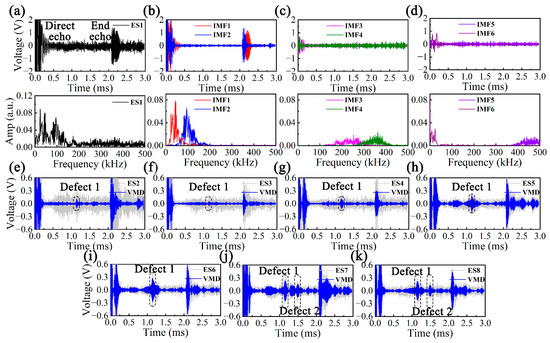 (a) ES1 in time and frequency domains, (b–d) IMFs of ES1 after applying VMD, (e) ES2, (f) ES3, (g) ES4, (h) ES5, (i) ES6, (j) ES7 and (k) ES8 before and after applying VMD.