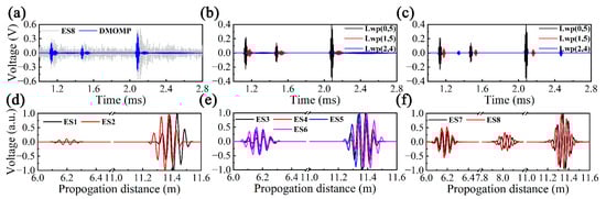 The effects of DMOMP on the experimental UGW signals are illustrated using ES8 as an example, as illustrated in Figure 16a–c. The reconstruction results consisting of nine atoms intuitively visualize defect 1, defect 2 and end echo and present a high SNR. It can be observed from the decomposition of ES8 that Lwp(1,5) and Lwp(2,4) are most likely to occur due to the mode conversion of Lwp(0,5). The non-dispersive atoms obtained by DMOMP were converted into the distance domain, and the distance domain signals of ES1-8 were finally obtained, as depicted in Figure 16d–f. Obviously, the distance domain signals are able to visualize the propagation distance while preserving the feature signals, such as defects and the pipe end, which is beneficial for defect localization.