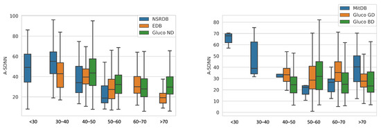 For the A_SDNN parameter, we also see differences between healthy patients and patients with arrhythmia or diabetes. The dependency function of age and SDNN for healthy patients rapidly declines, which is not the case for the other patients in the dataset. Compared with Umetani et al., our dependency function for A_SDNN in MitDB also shows a decline but is more gradual. This suggests that the relationship between age and SDNN is different for healthy patients and patients with arrhythmia or diabetes. This inverse coefficient to HRV is also present in the bad glucose regulation group of the Gluco dataset presented above.