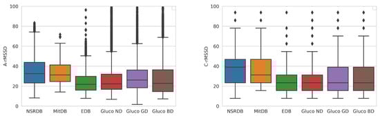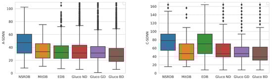 MitDB consists of only 30 min ECGs, so only the first-time duration method is used. EDB consists of 2 h ECGs, so the 30 min ECGs are calculated with the sliding window approach and one 2 h HRV calculation. The NSRDB and Gluco databases consist of long-term 24 h measurements, so the 30 min, 2 h, and 8 h HRV parameters are calculated with the sliding window approach. The analysis of the number of HRV calculation samples (for all datasets) is shown in Table 1.