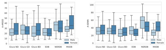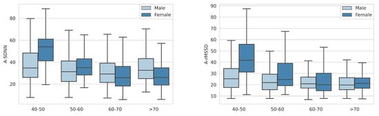 Several research studies analyze the correlation of HRV between men and women. This was usually conducted based on a subset of the parameters with the highest influence on HRV (SDNN, SDANN, ASDNN, RMSSD, NN50, pNN50, SDNNi, HF, LF). Ramaekers et al. [15] explain that cardiac autonomic modulation, as determined by HRV, is significantly lower in healthy women than in healthy men. HRV difference by gender was also concluded by Antelmi et al. [11], finding that HF, rMSSD, and pNN50 measures were more significant among women compared with men (p < 0.05) in all age groups.