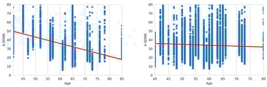 Umetani et al. [10] presented a dependency function for SDNN and age defined with y = 186.9 − 1.5x and rMSSD/age described with y = 32 − 0.69x.