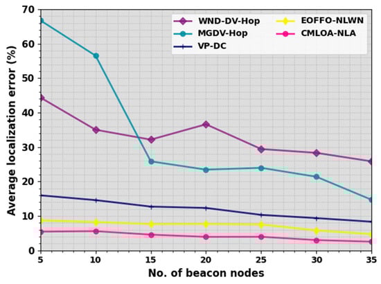 The NL results of the CMLOA-NLA technique are examined in terms of different metrics. In Table 1 and Figure 3, an average localization error (ALE) result of the CMLOA-NLA technique is compared under a distinct number of beacon nodes (NBNs) [28]. ALE measures the accuracy of the node localization. It determines the mean error between the estimated positions and the ground truth positions of the nodes. The results highlight that the CMLOA-NLA technique offers reduced ALE values over all NBN values. On an NBN of 5, the CMLOA-NLA technique provides a decreasing ALE of 5.46% while the WND-DV-Hop, MGDV-Hop, VPDC, and EOFFONLWN models offer an increased ALE of 44.4%, 66.79%, 16%, and 8.73%, respectively.