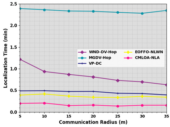 In Table 4 and Figure 6, an LT outcome of the CMLOA-NLA methodology is compared on a distinct number of CRs. The outcome highlights that the CMLOA-NLA algorithm offers reduced LT values over all CR values. On a CR of 5 m, the CMLOA-NLA system provides a lesser LT of 0.200 min while the WND-DV-Hop, MGDV-Hop, VPDC, and EOFFONLWN approaches attain an improved LT of 1.219 min, 2.391 min, 0.489 min, and 0.391 min, correspondingly. Also, on a CR of 15 m, the CMLOA-NLA method offers a lesser LT of 0.149 min while the WND-DV-Hop, MGDV-Hop, VPDC, and EOFFONLWN algorithm offer an enhanced LT of 0.87 min, 2.335 min, 0.474 min, and 0.367 min, correspondingly.