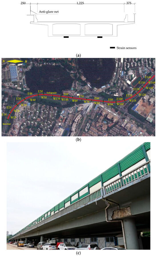 The target crossroad bridge is located in Shenzhen, China, with a total length of 1270 m along the center line of the road; it was constructed in 1999. This crossroad bridge is designed as a two-way six-lane bridge, with a superstructure prestressed continuous beam that has a common height of 2.0 m. The whole crossroad bridge is divided into two sections, the east and the west, with the east bridge comprising 14 spans, and the west bridge comprising 16 spans. The cross-section of the east bridge is single-box with a double-chamber structure (see Figure 1a) and a deck width of 14.74 m. As for the west bridge, it has the same cross-section and deck width as the east bridge, except the W13# bridge, which has a cross-section of a single box with three rooms and a deck width of 17.74 m. The piers of the crossroad bridge mainly consist of single-column piers with a diameter of 1.5 m; the top of some piers are enlarged to 2.0 m in order to accommodate bearings. Double-column piers have a diameter of 1.3 m and adopt the concealed cap beam. A picture of the target crossroad bridge is shown in Figure 1.