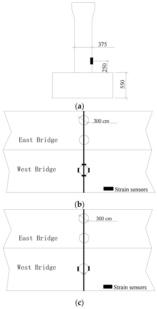 Arrangements of strain measuring points of a bridge pier: (a) arrangement of strain measuring points in a bridge pier; (b) “cross-shaped” arrangement; (c) “I-shaped” arrangement.