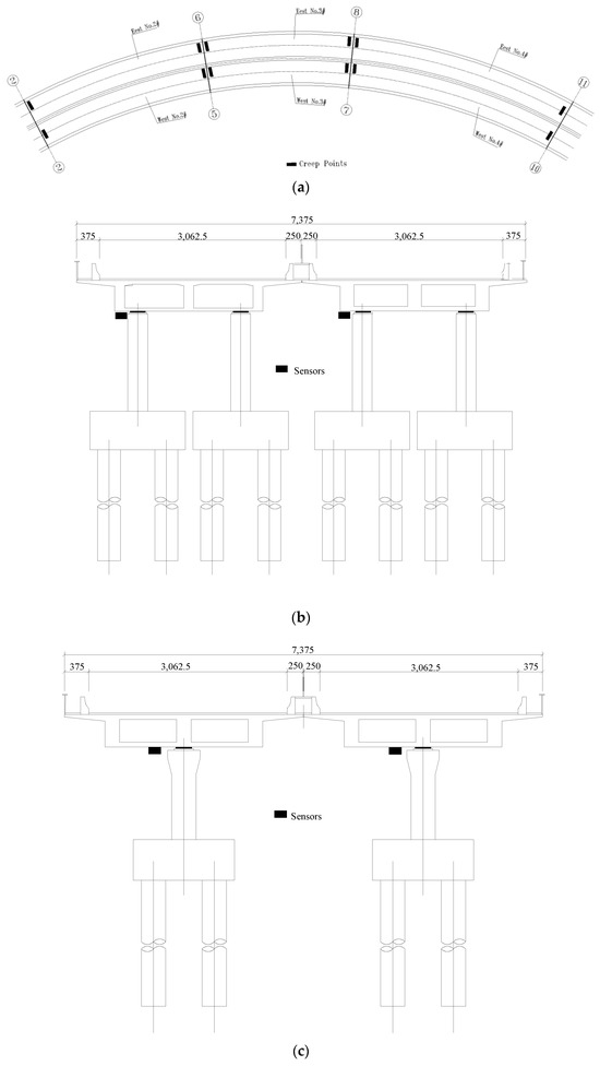 As a prestressed concrete continuous girder bridge, the strain monitoring of the main girder of the crossroad bridge focuses on the mid-span section of the main girder and the top section of a pier. The monitoring of stress (strain) levels in the main girder enables the analysis of the overall stress levels to determine if the data exceed the limit value or if stress has changed suddenly from the previous monitoring results. In light of the previous inspection results that identified vertical cracks in the webs of all bridges and horizontal cracks in the bottom plate, especially in the curved bridge section, 15 strain monitoring sections of the main girder were arranged throughout the bridge. To capture the specific defects of the bridge, with the pier top section being lightly affected, 30 measuring points were arranged in total, with two measuring points at the bottom plate of the mid-span position of the beam body selected in each section. The arrangements of strain measuring points of the main girder are shown in Figure 4.