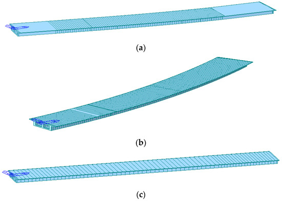 Finite element model of selected bridge sections: (a) West No.9#; (b) West No.11#; (c) West No.6#.