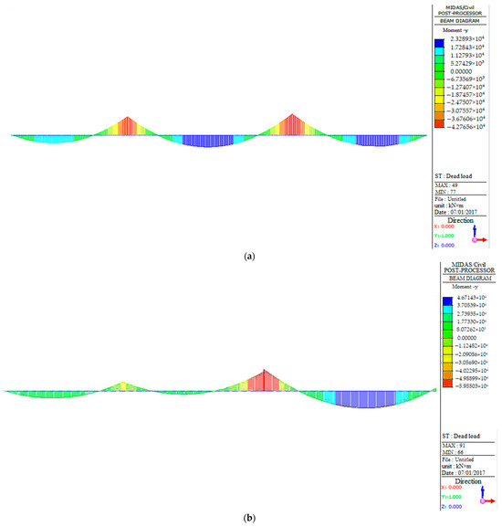 Maximum and minimum moments of the main girder of the triple bridge span under a dead load.