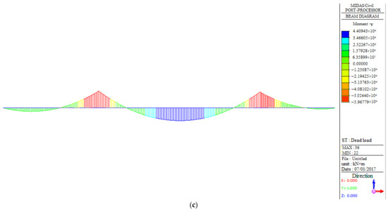 Internal force analysis under a dead load: (a) moment of West No.9# with a dead load; (b) moment of West No.11# with a dead load; (c) moment of West No.6# with a dead load.