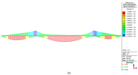 Internal force analysis under a live load: (a) moment of West No.9# with a live load; (b) moment of West No.11# with a live load; (c) moment of West No.6# with a live load.