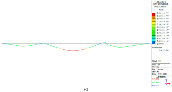 Furthermore, in order to monitor the deformation and stress distribution of the structure during the operation stage, the deflection and stress distribution of the structure was also analyzed based on the finite element model. Figure 11 shows that the deflection of the bridge under vehicle load follows the same trend as the bending moment diagram (Figure 10). The largest deflection for West No.9# and West No.6# occurs in the mid-span, while West No.11# has the largest deflection in the right span. Figure 12 indicates that the stress distribution of the bridge under the design load has a similar trend to that shown in Figure 10. Those parts with high structural stress should be the focus of attention, referring to the two supports and the middle position of the mid-span in West No.9# and No.6# bridges, as well as the right support of the mid-span and middle position of the right span in West No.11#.