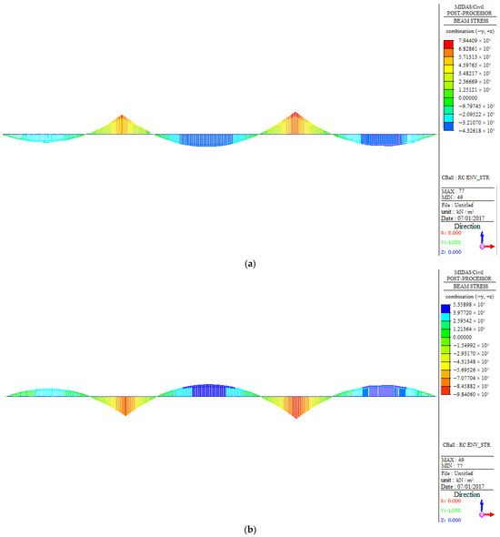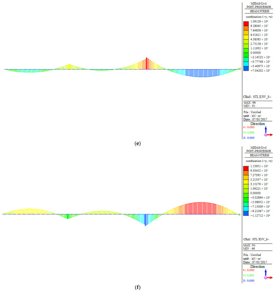 Table 4 reveals that for the extreme moment of bridges under a dead load, the moment of West No.11# is similar to that of West No.6#, while West No.9# has the smallest moment, consistent with the moment of the bridge under a dead load (as shown in Table 3). In addition, by comparing this with Table 3, it can be found that the extreme moment under a live load is smaller than that under a dead load, suggesting that the bridges are more affected by gravity during the operation stage.