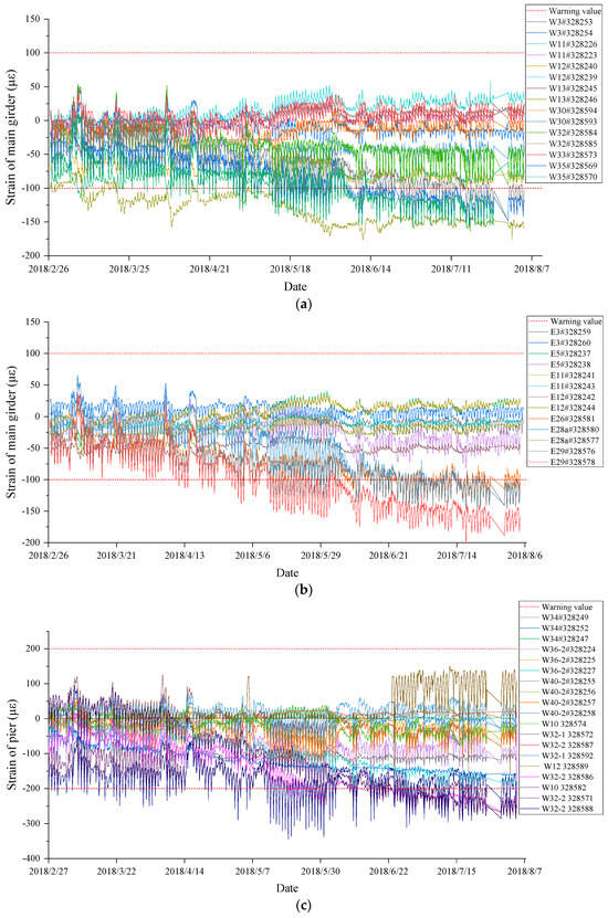 Similarly, all of the strain-measuring sensors of the piers worked normally during the monitoring. Because some sensors were located in the construction area, the data suddenly changed obviously, but the long-term trend of the data was stable, which means that no structural defects occurred. Among the pier strain-measuring points, the data of two positions exceeded the limit (listed in Table 6), and the data of other measuring points were in a normal state. As the out-of-limit points were near the construction area under the bridge, the influence of construction on the strain of a pier should be considered, and these two positions should be paid continuous attention.