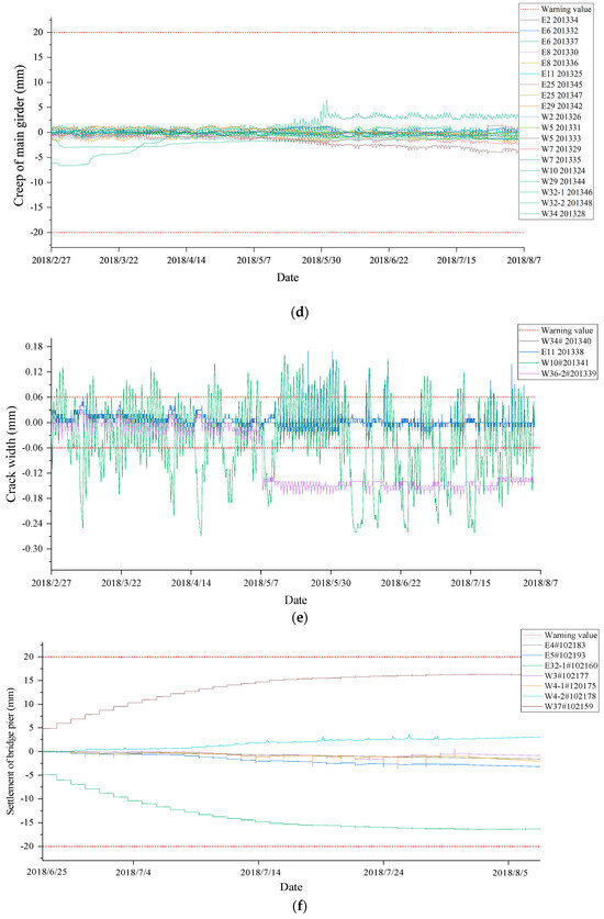 Abnormal data in time history: (a) strain of the main girder on west bridges; (b) strain of the main girder on east bridges; (c) strain of bridge piers; (d) creep of the main girder; (e) crack width; (f) settlement of bridge piers.