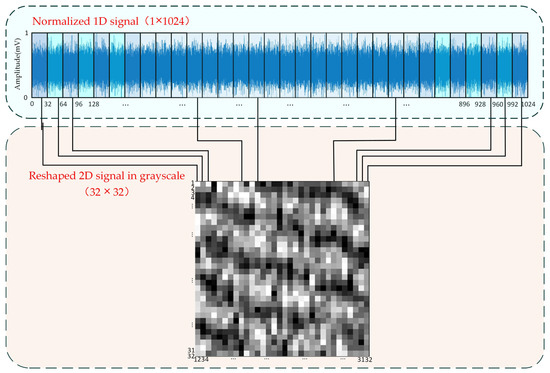 where x represents the input signal, and xmin and xmax represent the minimum and maximum values of signal x, respectively. The output of an RGB image does not generate redundant features; thus, gray images convert the three channels into one channel without any additional operations, resulting in a significant reduction in computational requirements. Then, the collected one-dimensional data signal is reconstructed to form a gray image. In order to optimize the efficiency of network training, it is advisable to limit the size of the fully connected layer structure. This study employs a sampling point length of 1024 for the intercepted one-dimensional signal. Additionally, for computational convenience, the input gray image is designed with equal length and height. Consequently, the one-dimensional signal is evenly divided into 32 segments on average, each segment having a length of 32. Every 32 data points form a column of the grayscale map, and 32 segments of data are stacked with 32 columns and finally reconstructed into 32 × 32 two-dimensional grayscale images. The detailed operation is shown in Figure 2.