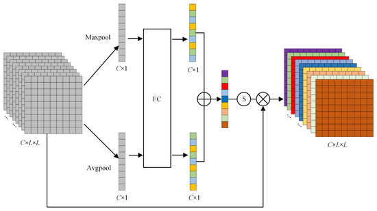 Considering that different channels contain different contribution degrees of fault-characteristic information, the channel attention mechanism is used to assign different weight values to each channel [25,26]. The specific operation process is shown in Figure 4. Firstly, the input signals are processed by global average pooling and global maximum pooling, respectively. The acoustic signals of each channel are compressed and the fault features of each channel are compressed into a global feature. Then, the generated two feature maps are fed into the multilayer perceptron (MLP) with shared weights for interchannel learning, and the dimensionality between the two neural layers is reduced by compression ratio. Finally, the MLP output features are added and activated by sigmoid function to generate channel weight ωc and calculate the output features according to element multiplication. The expression is defined as follows: