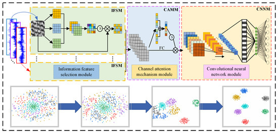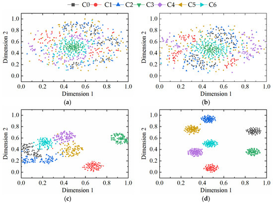 In order to understand the details of data processing in each process of the model, a t-distributed stochastic neighbor embedding algorithm (t-SNE) is used to process the initial input stage, information feature selection, channel attention mechanism, and convolutional neural network of various fault data. The results are shown in Figure 14. It can be seen from Figure 14a that when the data first entered the model, the distribution was irregular and random. In Figure 14b, the feature distribution gradually became regular, and data of different categories began to gather within the class. In Figure 14c, the spacing within the class gradually increased to achieve effective classification results. The classification effects of various faults are clearly discernible in Figure 14d, ultimately.