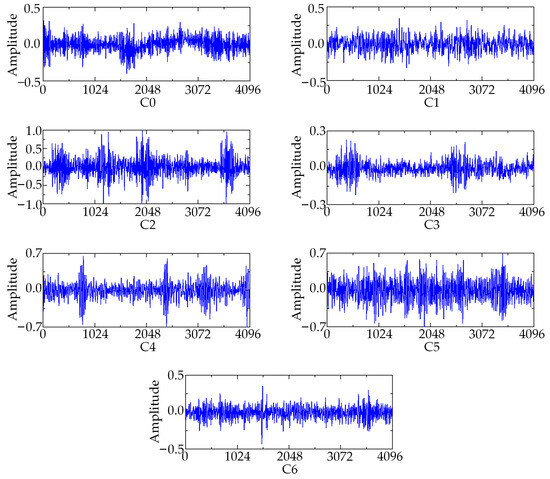 In the process of dataset processing, the failures can be categorized into seven types, which include inner failure, outer failure, rolling element failure, cage failure, and coupling failure. Each fault type contains 500 samples, of which 80% of the dataset is used for network training, while the remaining 20% of the dataset is used for testing and verification. The details of the dataset are shown in Table 2. The fault types are categorized with numerical labels ranging from C0 to C6. In addition, the tenfold crossover method was used for comparative analysis in the experiments. The length of the data sample is 1024. The motor speed is 1200 rpm. The judicious selection of batch size and learning rate not only yields a relatively robust model but also significantly reduces computational overhead. The model optimizer utilizes the Adam algorithm with a learning rate of 0.001 and epochs set to 100. Both training and testing sample batch sizes are set to 36, while model parameters are updated automatically through backpropagation. Taking measuring point 1 as an example, the time-domain signals of seven different fault types are shown in Figure 10.