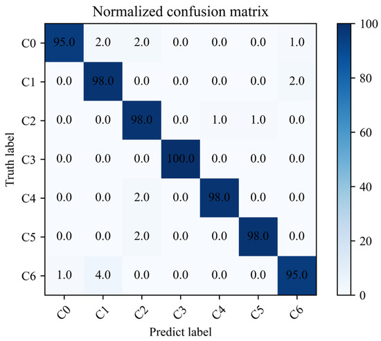 The training and testing process and loss value of the proposed algorithm are shown in Figure 11. It can be seen from Figure 11 that the training accuracy of the proposed algorithm reaches convergence when it iterates about 18 times. The final accuracy of the test set is maintained at about 98%. The loss value of the model decreases rapidly with the increase in the number of iterations and finally remains stable. From the analysis results, it can be concluded that the method proposed in this paper can effectively propose the fault characteristics of rolling bearings from the acoustic array signal. In order to further analyze the difficulty of feature extraction of each type of sound fault signal, the confusion matrix of the test set is shown in Figure 12. The classification accuracy of C0 and C6 fault data is poor, but it is also maintained at 95%. The diagnostic accuracy of other categories is above 98%, which indicates that the proposed method can effectively diagnose the running state of rolling bearings under different fault conditions.
