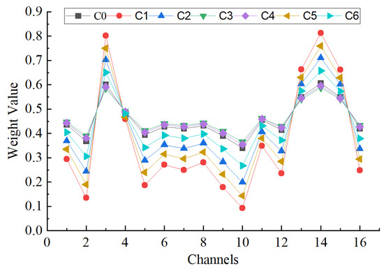 Figure 13 describes the weight proportion of seven types of faults under different channels. It can be clearly seen from Figure 10 that different acoustic array channels have different weight contribution values. Channel 3 and channel 14 have the largest weight contribution values, with a weight coefficient of 0.8, while the weight contribution values of other channels are relatively low. It is further proved that it is necessary to apply the channel attention mechanism module.